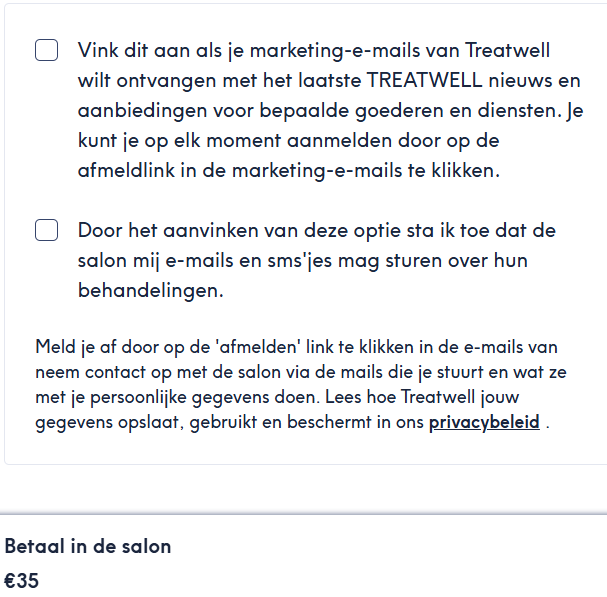 • Je ontvangt nog steeds een bevestigingsmail -en herrinneringsmail. Laatstgenoemde ontvang je 26 uur alvorens de afspraak plaatsvindt. Let op: de afzender is Treatwel NL! Nieuw is dat je een herrinnerings SMS ontvangt, 4 uren vóór de afspraak. Gratis annuleren kan tot 24 uur vóór de afspraak.